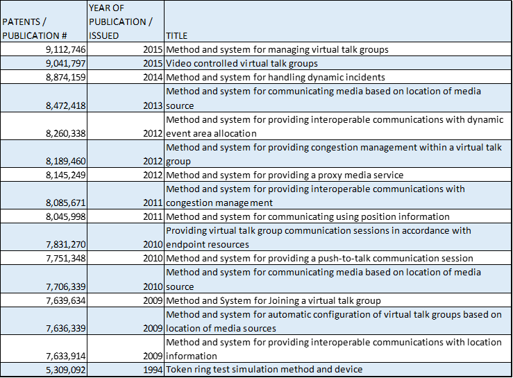 Have filed for 30+ patents in the areas of networking, policy management, push-to-talk interoperability, location-based media resources, dynamic event area location, security, and mobility services.